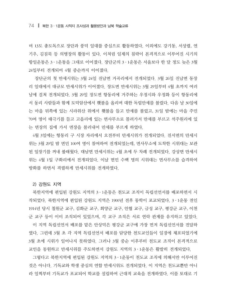 74 ❙ 북한 3·1운동 사적지 조사성과 활용방안과 남북 학술교류 며 13도 총도독으로 장단과 풍덕 일대를 중심으로 활동하였다. 이외에도 강기동, 서상렬, 연 기우, 김짐묵 등 의병장의 활동이 있다. 이처럼 일제의 침략이 본격적으로 이루어진 시기의 항일운동은 3·1운동을 그대로 이어졌다. 장단군의 3·1운동은 서울보다 한 달 정도 늦은 3월 24일부터 전개되어 4월 중순까지 이어졌다. 장단군의 첫 만세시위는 3월 24일 진남면 거곡리에서 전개되었다. 3월 26일 진남면 동장 리 일대에서 대규모 만세시위가 이어졌다. 장도면 만세시위는 3월 29일부터 4월 초까지 여러 날에 걸쳐 전개되었다. 3월 29일 장도면 항동리에 거주하는 우정시와 우정화 등이 항동리에 서 동리 사람들과 함께 도덕암산에서 횃불을 올리며 대한 독립만세를 불렀다. 다음 날 30일에 는 마을 뒤쪽에 있는 시라위산 위에서 횃불을 들고 만세를 불렀고, 31일 밤에는 마을 주민 70여 명이 태극기를 들고 고읍리에 있는 면사무소로 몰려가서 만세를 부르고 석주원리에 있 는 면장의 집에 가서 면장을 불러내어 만세를 부르게 하였다. 4월 3일에는 항동리 구 시장 자리에서 오전부터 만세시위가 전개되었다. 진서면의 만세시 위는 3월 29일 밤 면민 100여 명이 참여하여 전개되었는데, 면사무소에 도착한 시위대는 보관 된 일장기를 꺼내 불태웠다. 대남면 만세시위는 4월 초에 두 차례 전개되었다. 강상면 만세시 위는 4월 1일 구화리에서 전개되었다. 이날 면민 수백 명의 시위대는 면사무소를 습격하여 방화를 하면서 격렬하게 만세시위를 전개하였다. 2) 강원도 지역 북한지역에 편입된 강원도 지역의 3·1운동은 천도교 조직이 독립선언서를 배포하면서 시 작되었다. 북한지역에 편입된 강원도 지역은 1900년 전후 동학이 포교되었다. 3·1운동 전인 1914년 당시 철원군 교구, 김화군 교구, 회양군 교구, 안협 교구, 금성 교구, 평강군 교구, 이천 군 교구 등이 이미 조직되어 있었으며, 각 교구 조직은 서로 연락 관계를 유지하고 있었다. 이 지역 독립선언서 배포를 맡은 안상덕은 평강군 교구에 가장 먼저 독립선언서를 전달하 였다. 그런데 3월 초 각 지역 독립선언서 배포를 담당한 천도교인들이 일경에 체포되었기에 3월 초에 시위가 일어나지 못하였다. 그러나 3월 중순 이후부터 천도교 조직이 본격적으로 교인을 동원하고 만세시위를 주도하면서 강원도 지역의 3·1운동은 활발히 전개되었다. 그렇다고 북한지역에 편입된 강원도 지역의 3·1운동이 천도교 조직에 의해서만 이루어진 것은 아니다. 기독교와 학생 중심의 연합 만세시위도 전개되었다. 이 지역은 천도교뿐만 아니 라 일찍부터 기독교가 포교되어 학교를 설립하여 근대적 교육을 전개하였다. 이를 토대로 기