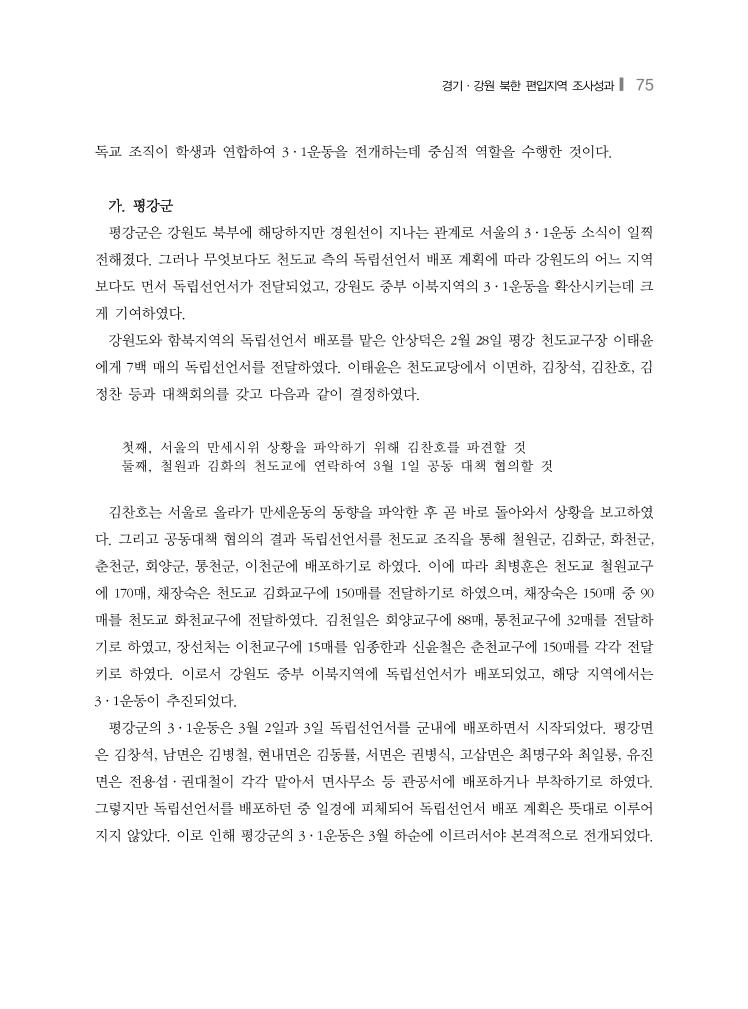 경기·강원 북한 편입지역 조사성과❙ 75 독교 조직이 학생과 연합하여 3·1운동을 전개하는데 중심적 역할을 수행한 것이다. 가. 평강군 평강군은 강원도 북부에 해당하지만 경원선이 지나는 관계로 서울의 3·1운동 소식이 일찍 전해졌다. 그러나 무엇보다도 천도교 측의 독립선언서 배포 계획에 따라 강원도의 어느 지역 보다도 먼서 독립선언서가 전달되었고, 강원도 중부 이북지역의 3·1운동을 확산시키는데 크 게 기여하였다. 강원도와 함북지역의 독립선언서 배포를 맡은 안상덕은 2월 28일 평강 천도교구장 이태윤 에게 7백 매의 독립선언서를 전달하였다. 이태윤은 천도교당에서 이면하, 김창석, 김찬호, 김 정찬 등과 대책회의를 갖고 다음과 같이 결정하였다. 첫째, 서울의 만세시위 상황을 파악하기 위해 김찬호를 파견할 것 둘째, 철원과 김화의 천도교에 연락하여 3월 1일 공동 대책 협의할 것 김찬호는 서울로 올라가 만세운동의 동향을 파악한 후 곧 바로 돌아와서 상황을 보고하였 다. 그리고 공동대책 협의의 결과 독립선언서를 천도교 조직을 통해 철원군, 김화군, 화천군, 춘천군, 회양군, 통천군, 이천군에 배포하기로 하였다. 이에 따라 최병훈은 천도교 철원교구 에 170매, 채장숙은 천도교 김화교구에 150매를 전달하기로 하였으며, 채장숙은 150매 중 90 매를 천도교 화천교구에 전달하였다. 김천일은 회양교구에 88매, 통천교구에 32매를 전달하 기로 하였고, 장선처는 이천교구에 15매를 임종한과 신윤철은 춘천교구에 150매를 각각 전달 키로 하였다. 이로서 강원도 중부 이북지역에 독립선언서가 배포되었고, 해당 지역에서는 3·1운동이 추진되었다. 평강군의 3·1운동은 3월 2일과 3일 독립선언서를 군내에 배포하면서 시작되었다. 평강면 은 김창석, 남면은 김병철, 현내면은 김동률, 서면은 권병식, 고삽면은 최명구와 최일룡, 유진 면은 전용섭·권대철이 각각 맡아서 면사무소 등 관공서에 배포하거나 부착하기로 하였다. 그렇지만 독립선언서를 배포하던 중 일경에 피체되어 독립선언서 배포 계획은 뜻대로 이루어 지지 않았다. 이로 인해 평강군의 3·1운동은 3월 하순에 이르러서야 본격적으로 전개되었다.