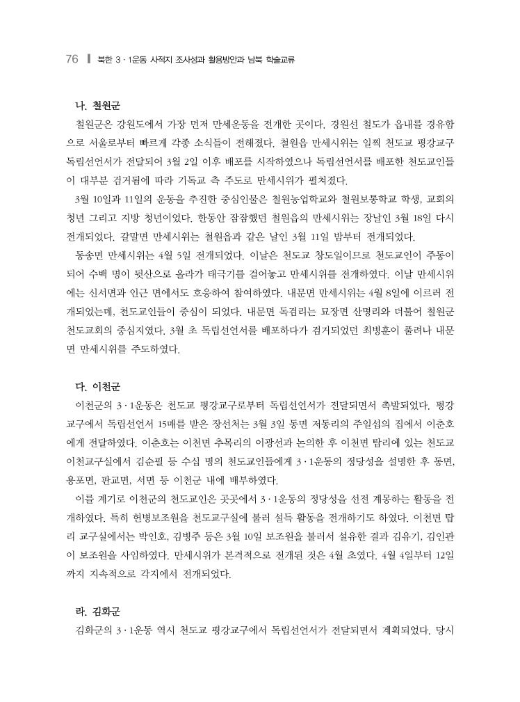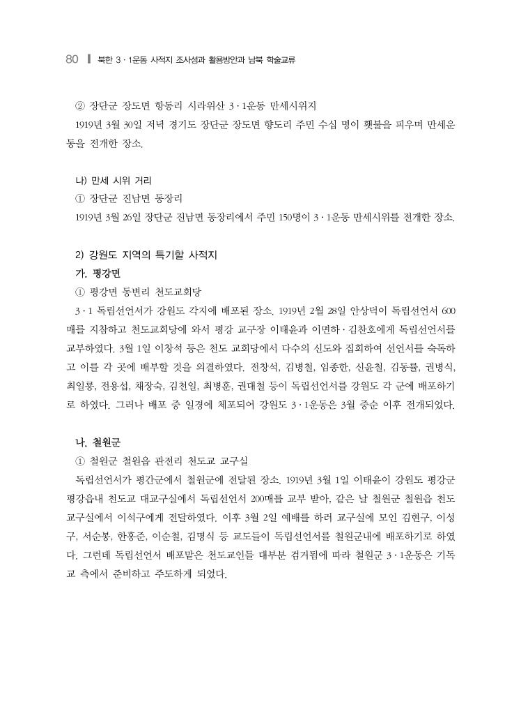76 ❙ 북한 3·1운동 사적지 조사성과 활용방안과 남북 학술교류 나. 철원군 철원군은 강원도에서 가장 먼저 만세운동을 전개한 곳이다. 경원선 철도가 읍내를 경유함 으로 서울로부터 빠르게 각종 소식들이 전해졌다. 철원읍 만세시위는 일찍 천도교 평강교구 독립선언서가 전달되어 3월 2일 이후 배포를 시작하였으나 독립선언서를 배포한 천도교인들 이 대부분 검거됨에 따라 기독교 측 주도로 만세시위가 펼쳐졌다. 3월 10일과 11일의 운동을 추진한 중심인물은 철원농업학교와 철원보통학교 학생, 교회의 청년 그리고 지방 청년이었다. 한동안 잠잠했던 철원읍의 만세시위는 장날인 3월 18일 다시 전개되었다. 갈말면 만세시위는 철원읍과 같은 날인 3월 11일 밤부터 전개되었다. 동송면 만세시위는 4월 5일 전개되었다. 이날은 천도교 창도일이므로 천도교인이 주동이 되어 수백 명이 뒷산으로 올라가 태극기를 걸어놓고 만세시위를 전개하였다. 이날 만세시위 에는 신서면과 인근 면에서도 호응하여 참여하였다. 내문면 만세시위는 4월 8일에 이르러 전 개되었는데, 천도교인들이 중심이 되었다. 내문면 독검리는 묘장면 산명리와 더불어 철원군 천도교회의 중심지였다. 3월 초 독립선언서를 배포하다가 검거되었던 최병훈이 풀려나 내문 면 만세시위를 주도하였다. 다. 이천군 이천군의 3·1운동은 천도교 평강교구로부터 독립선언서가 전달되면서 촉발되었다. 평강 교구에서 독립선언서 15매를 받은 장선처는 3월 3일 동면 저동리의 주일섭의 집에서 이춘호 에게 전달하였다. 이춘호는 이천면 추목리의 이광선과 논의한 후 이천면 탑리에 있는 천도교 이천교구실에서 김순필 등 수십 명의 천도교인들에게 3·1운동의 정당성을 설명한 후 동면, 용포면, 판교면, 서면 등 이천군 내에 배부하였다. 이를 계기로 이천군의 천도교인은 곳곳에서 3·1운동의 정당성을 선전 계몽하는 활동을 전 개하였다. 특히 헌병보조원을 천도교구실에 불러 설득 활동을 전개하기도 하였다. 이천면 탑 리 교구실에서는 박인호, 김병주 등은 3월 10일 보조원을 불러서 설유한 결과 김유기, 김인관 이 보조원을 사임하였다. 만세시위가 본격적으로 전개된 것은 4월 초였다. 4월 4일부터 12일 까지 지속적으로 각지에서 전개되었다. 라. 김화군 김화군의 3·1운동 역시 천도교 평강교구에서 독립선언서가 전달되면서 계획되었다. 당시