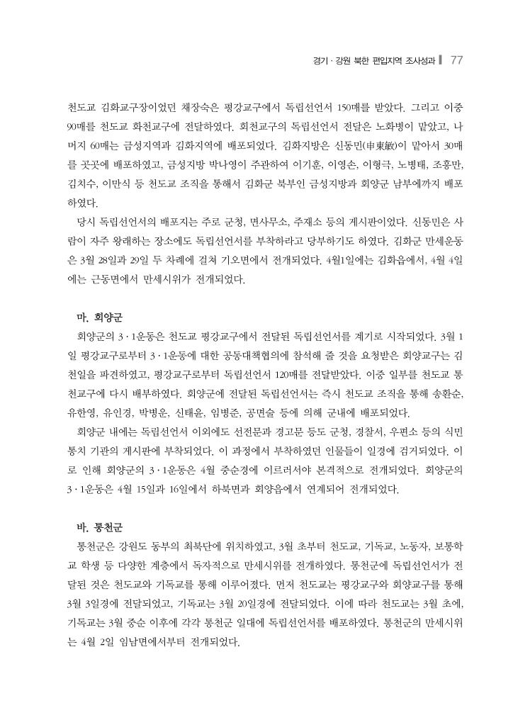 경기·강원 북한 편입지역 조사성과❙ 77 천도교 김화교구장이었던 채장숙은 평강교구에서 독립선언서 150매를 받았다. 그리고 이중 90매를 천도교 화천교구에 전달하였다. 회천교구의 독립선언서 전달은 노화병이 맡았고, 나 머지 60매는 금성지역과 김화지역에 배포되었다. 김화지방은 신동민(申東敏)이 맡아서 30매 를 곳곳에 배포하였고, 금성지방 박나영이 주관하여 이기훈, 이영손, 이형극, 노병태, 조흥만, 김치수, 이만식 등 천도교 조직을 통해서 김화군 북부인 금성지방과 회양군 남부에까지 배포 하였다. 당시 독립선언서의 배포지는 주로 군청, 면사무소, 주재소 등의 게시판이었다. 신동민은 사 람이 자주 왕래하는 장소에도 독립선언서를 부착하라고 당부하기도 하였다. 김화군 만세운동 은 3월 28일과 29일 두 차례에 걸쳐 기오면에서 전개되었다. 4월1일에는 김화읍에서, 4월 4일 에는 근동면에서 만세시위가 전개되었다. 마. 회양군 회양군의 3·1운동은 천도교 평강교구에서 전달된 독립선언서를 계기로 시작되었다. 3월 1 일 평강교구로부터 3·1운동에 대한 공동대책협의에 참석해 줄 것을 요청받은 회양교구는 김 천일을 파견하였고, 평강교구로부터 독립선언서 120매를 전달받았다. 이중 일부를 천도교 통 천교구에 다시 배부하였다. 회양군에 전달된 독립선언서는 즉시 천도교 조직을 통해 송환순, 유한영, 유인경, 박병운, 신태윤, 임병준, 공면술 등에 의해 군내에 배포되었다. 회양군 내에는 독립선언서 이외에도 선전문과 경고문 등도 군청, 경찰서, 우편소 등의 식민 통치 기관의 게시판에 부착되었다. 이 과정에서 부착하였던 인물들이 일경에 검거되었다. 이 로 인해 회양군의 3·1운동은 4월 중순경에 이르러서야 본격적으로 전개되었다. 회양군의 3·1운동은 4월 15일과 16일에서 하북면과 회양읍에서 연계되어 전개되었다. 바. 통천군 통천군은 강원도 동부의 최북단에 위치하였고, 3월 초부터 천도교, 기독교, 노동자, 보통학 교 학생 등 다양한 계층에서 독자적으로 만세시위를 전개하였다. 통천군에 독립선언서가 전 달된 것은 천도교와 기독교를 통해 이루어졌다. 먼저 천도교는 평강교구와 회양교구를 통해 3월 3일경에 전달되었고, 기독교는 3월 20일경에 전달되었다. 이에 따라 천도교는 3월 초에, 기독교는 3월 중순 이후에 각각 통천군 일대에 독립선언서를 배포하였다. 통천군의 만세시위 는 4월 2일 임남면에서부터 전개되었다.