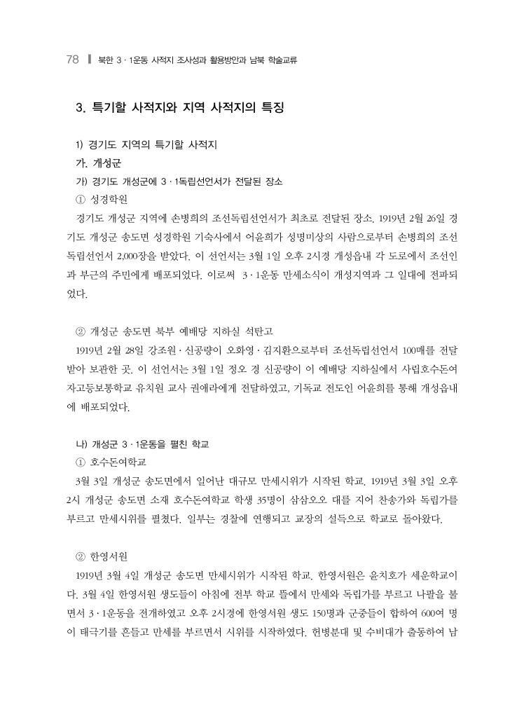 78 ❙ 북한 3·1운동 사적지 조사성과 활용방안과 남북 학술교류 3. 특기할 사적지와 지역 사적지의 특징 1) 경기도 지역의 특기할 사적지 가. 개성군 가) 경기도 개성군에 3·1독립선언서가 전달된 장소 ① 성경학원 경기도 개성군 지역에 손병희의 조선독립선언서가 최초로 전달된 장소. 1919년 2월 26일 경 기도 개성군 송도면 성경학원 기숙사에서 어윤희가 성명미상의 사람으로부터 손병희의 조선 독립선언서 2,000장을 받았다. 이 선언서는 3월 1일 오후 2시경 개성읍내 각 도로에서 조선인 과 부근의 주민에게 배포되었다. 이로써 3·1운동 만세소식이 개성지역과 그 일대에 전파되 었다. ② 개성군 송도면 북부 예배당 지하실 석탄고 1919년 2월 28일 강조원·신공량이 오화영·김지환으로부터 조선독립선언서 100매를 전달 받아 보관한 곳. 이 선언서는 3월 1일 정오 경 신공량이 이 예배당 지하실에서 사립호수돈여 자고등보통학교 유치원 교사 권애라에게 전달하였고, 기독교 전도인 어윤희를 통해 개성읍내 에 배포되었다. 나) 개성군 3·1운동을 펼친 학교 ① 호수돈여학교 3월 3일 개성군 송도면에서 일어난 대규모 만세시위가 시작된 학교. 1919년 3월 3일 오후 2시 개성군 송도면 소재 호수돈여학교 학생 35명이 삼삼오오 대를 지어 찬송가와 독립가를 부르고 만세시위를 펼쳤다. 일부는 경찰에 연행되고 교장의 설득으로 학교로 돌아왔다. ② 한영서원 1919년 3월 4일 개성군 송도면 만세시위가 시작된 학교. 한영서원은 윤치호가 세운학교이 다. 3월 4일 한영서원 생도들이 아침에 전부 학교 뜰에서 만세와 독립가를 부르고 나팔을 불 면서 3·1운동을 전개하였고 오후 2시경에 한영서원 생도 150명과 군중들이 합하여 600여 명 이 태극기를 흔들고 만세를 부르면서 시위를 시작하였다. 헌병분대 및 수비대가 출동하여 남