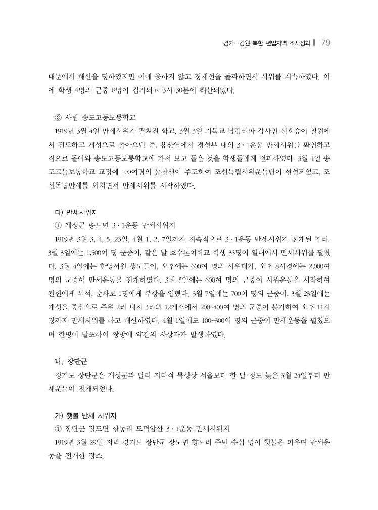 경기·강원 북한 편입지역 조사성과❙ 79 대문에서 해산을 명하였지만 이에 응하지 않고 경계선을 돌파하면서 시위를 계속하였다. 이 에 학생 4명과 군중 8명이 검거되고 3시 30분에 해산되었다. ③ 사립 송도고등보통학교 1919년 3월 4일 만세시위가 펼쳐진 학교. 3월 3일 기독교 남감리파 감사인 신호승이 철원에 서 전도하고 개성으로 돌아오던 중, 용산역에서 경성부 내의 3·1운동 만세시위를 확인하고 집으로 돌아와 송도고등보통학교에 가서 보고 들은 것을 학생들에게 전파하였다. 3월 4일 송 도고등보통학교 교정에 100여명의 동창생이 주도하여 조선독립시위운동단이 형성되었고, 조 선독립만세를 외치면서 만세시위를 시작하였다. 다) 만세시위지 ① 개성군 송도면 3·1운동 만세시위지 1919년 3월 3, 4, 5, 23일, 4월 1, 2, 7일까지 지속적으로 3·1운동 만세시위가 전개된 거리. 3월 3일에는 1,500여 명 군중이, 같은 날 호수돈여학교 학생 35명이 일대에서 만세시위를 펼쳤 다. 3월 4일에는 한영서원 생도들이, 오후에는 600여 명의 시위대가, 오후 8시경에는 2,000여 명의 군중이 만세운동을 전개하였다. 3월 5일에는 600여 명의 군중이 시위운동을 시작하여 관헌에게 투석, 순사보 1명에게 부상을 입혔다. 3월 7일에는 700여 명의 군중이, 3월 23일에는 개성을 중심으로 주위 2리 내지 3리의 12개소에서 200~400여 명의 군중이 봉기하여 오후 11시 경까지 만세시위를 하고 해산하였다. 4월 1일에도 100~300여 명의 군중이 만세운동을 펼쳤으 며 헌병이 발포하여 쌍방에 약간의 사상자가 발생하였다. 나. 장단군 경기도 장단군은 개성군과 달리 지리적 특성상 서울보다 한 달 정도 늦은 3월 24일부터 만 세운동이 전개되었다. 가) 횃불 반세 시위지 ① 장단군 장도면 항동리 도덕암산 3·1운동 만세시위지 1919년 3월 29일 저녁 경기도 장단군 장도면 향도리 주민 수십 명이 횃불을 피우며 만세운 동을 전개한 장소.
