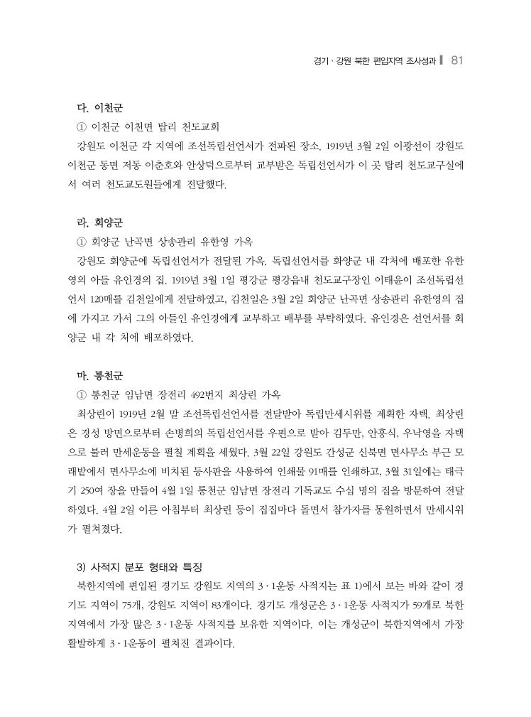 경기·강원 북한 편입지역 조사성과❙ 81 다. 이천군 ① 이천군 이천면 탑리 천도교회 강원도 이천군 각 지역에 조선독립선언서가 전파된 장소. 1919년 3월 2일 이광선이 강원도 이천군 동면 저동 이춘호와 안상덕으로부터 교부받은 독립선언서가 이 곳 탑리 천도교구실에 서 여러 천도교도원들에게 전달했다. 라. 회양군 ① 회양군 난곡면 상송관리 유한영 가옥 강원도 회양군에 독립선언서가 전달된 가옥. 독립선언서를 화양군 내 각처에 배포한 유한 영의 아들 유인경의 집. 1919년 3월 1일 평강군 평강읍내 천도교구장인 이태윤이 조선독립선 언서 120매를 김천일에게 전달하였고, 김천일은 3월 2일 회양군 난곡면 상송관리 유한영의 집 에 가지고 가서 그의 아들인 유인경에게 교부하고 배부를 부탁하였다. 유인경은 선언서를 회 양군 내 각 처에 배포하였다. 마. 통천군 ① 통천군 임남면 장전리 492번지 최상린 가옥 최상린이 1919년 2월 말 조선독립선언서를 전달받아 독립만세시위를 계획한 자택. 최상린 은 경성 방면으로부터 손병희의 독립선언서를 우편으로 받아 김두만, 안흥식, 우낙영을 자택 으로 불러 만세운동을 펼칠 계획을 세웠다. 3월 22일 강원도 간성군 신북면 면사무소 부근 모 래밭에서 면사무소에 비치된 등사판을 사용하여 인쇄물 91매를 인쇄하고, 3월 31일에는 태극 기 250여 장을 만들어 4월 1일 통천군 임남면 장전리 기독교도 수십 명의 집을 방문하여 전달 하였다. 4월 2일 이른 아침부터 최상린 등이 집집마다 돌면서 참가자를 동원하면서 만세시위 가 펼쳐졌다. 3) 사적지 분포 형태와 특징 북한지역에 편입된 경기도 강원도 지역의 3·1운동 사적지는 표 1)에서 보는 바와 같이 경 기도 지역이 75개, 강원도 지역이 83개이다. 경기도 개성군은 3·1운동 사적지가 59개로 북한 지역에서 가장 많은 3·1운동 사적지를 보유한 지역이다. 이는 개성군이 북한지역에서 가장 활발하게 3·1운동이 펼쳐진 결과이다.