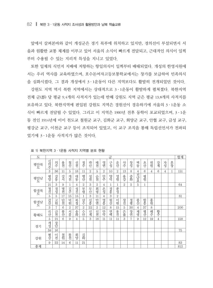 82 ❙ 북한 3·1운동 사적지 조사성과 활용방안과 남북 학술교류 앞에서 살펴본바와 같이 개성군은 경기 북부에 위치하고 있지만, 경의선이 부설되면서 서 울과 원활한 교통 체계를 이루고 있어 서울의 소식이 빠르게 전달되고, 근대적인 의식이 일찍 부터 수용될 수 있는 지리적 특성을 지니고 있었다. 또한 일제의 식민지 지배에 저항하는 항일의식이 일찍부터 배태되었다. 개성의 한영서원에 서는 우리 역사를 교육하였으며, 호수돈여자고등보통학교에서는 창가를 보급하여 민족의식 을 심화시켰다. 그 결과 개성에서 3·1운동이 다른 지역보다도 활발히 전개되었던 것이다. 강원도 지역 역시 북한 지역에서는 상대적으로 3·1운동이 활발하게 펼쳐졌다. 북한지역 전체 군(郡) 당 평균 9.4개의 사적지가 있는데 반해 강원도 지역 군은 평균 13.8개의 사적지를 보유하고 있다. 북한지역에 편입된 강원도 지역은 경원선이 경유하기에 서울의 3·1운동 소 식이 빠르게 전달될 수 있었다. 그리고 이 지역은 1900년 전후 동학이 포교되었으며, 3·1운 동 전인 1914년에 이미 천도교 철원군 교구, 김화군 교구, 회양군 교구, 안협 교구, 금성 교구, 평강군 교구, 이천군 교구 등이 조직되어 있었고, 이 교구 조직을 통해 독립선언서가 전파되 었기에 3·1운동 사적지가 많은 것이다. 표 1) 북한지역 3·1운동 사적지 지역별 분포 현황 도 군 합계 평안북 도 신 의 주 의 주 용 천 철 산 선 천 정 주 곽 산 태 천 영 변 구 성 운 산 삭 주 창 성 벽 동 초 산 위 원 강 계 자 성 후 창 3 36 11 5 18 11 2 5 2 10 2 13 8 4 6 4 6 4 1 151 평안남 도 평 양 강 동 강 서 개 천 대 동 맹 산 성 천 순 천 안 주 양 덕 영 원 용 강 중 화 진 남 포 평 원 21 3 9 1 4 2 3 2 4 1 1 2 5 5 1 64 함경북 도 청 진 경 성 명 천 길 주 성 진 부 령 무 산 회 령 온 성 경 흥 종 성 5 5 17 15 15 1 3 11 4 3 2 81 함경남 도 갑 산 고 원 단 천 덕 원 북 청 삼 수 신 흥 안 변 영 흥 원 산 이 원 장 진 정 평 풍 산 함 흥 홍 원 3 7 6 2 37 2 22 2 12 8 15 5 30 4 37 8 200 황해도 곡 산 금 천 봉 산 서 흥 송 화 수 안 신 계 신 천 안 악 연 백 옹 진 은 율 장 연 재 령 평 산 해 주 황 주 5 21 6 9 4 5 3 18 11 11 11 3 7 9 12 19 4 158 경기 개 성 장 단 59 16 75 강원 평 강 이 천 철 원 통 천 회 양 김 화 9 22 14 6 11 21 83 총계 812