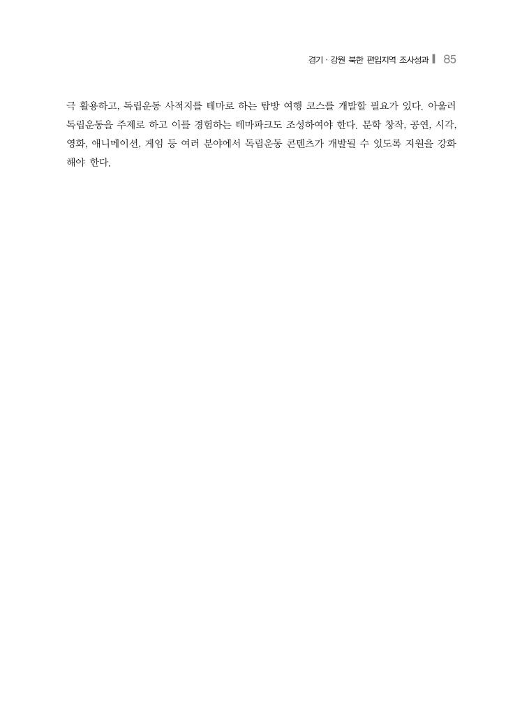 경기·강원 북한 편입지역 조사성과❙ 85 극 활용하고, 독립운동 사적지를 테마로 하는 탐방 여행 코스를 개발할 필요가 있다. 아울러 독립운동을 주제로 하고 이를 경험하는 테마파크도 조성하여야 한다. 문학 창작, 공연, 시각, 영화, 애니메이션, 게임 등 여러 분야에서 독립운동 콘텐츠가 개발될 수 있도록 지원을 강화 해야 한다.
