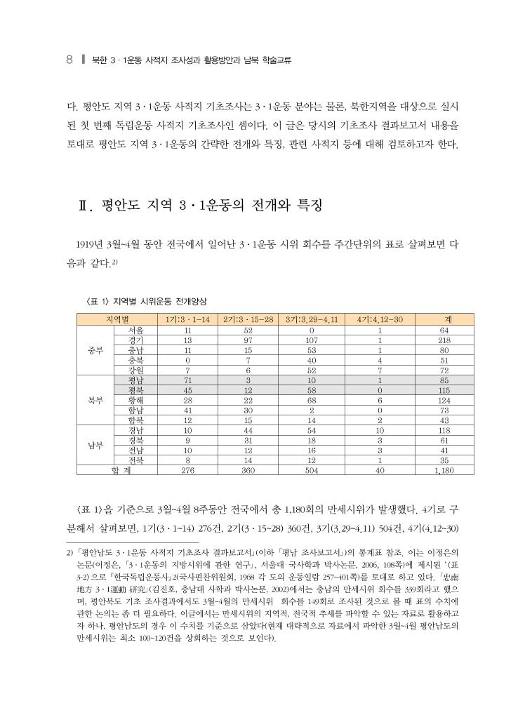8 ❙ 북한 3·1운동 사적지 조사성과 활용방안과 남북 학술교류 다. 평안도 지역 3·1운동 사적지 기초조사는 3·1운동 분야는 물론, 북한지역을 대상으로 실시 된 첫 번째 독립운동 사적지 기초조사인 셈이다. 이 글은 당시의 기초조사 결과보고서 내용을 토대로 평안도 지역 3·1운동의 간략한 전개와 특징, 관련 사적지 등에 대해 검토하고자 한다. Ⅱ. 평안도 지역 3·1운동의 전개와 특징 1919년 3월~4월 동안 전국에서 일어난 3·1운동 시위 회수를 주간단위의 표로 살펴보면 다 음과 같다.2) 지역별 1기:3·1-14 2기:3·15-28 3기:3.29-4.11 4기:4.12-30 계 중부 서울 11 52 0 1 64 경기 13 97 107 1 218 충남 11 15 53 1 80 충북 0 7 40 4 51 강원 7 6 52 7 72 북부 평남 71 3 10 1 85 평북 45 12 58 0 115 황해 28 22 68 6 124 함남 41 30 2 0 73 함북 12 15 14 2 43 남부 경남 10 44 54 10 118 경북 9 31 18 3 61 전남 10 12 16 3 41 전북 8 14 12 1 35 합 계 276 360 504 40 1,180 <표 1> 지역별 시위운동 전개양상 <표 1>을 기준으로 3월~4월 8주동안 전국에서 총 1,180회의 만세시위가 발생했다. 4기로 구 분해서 살펴보면, 1기(3·1~14) 276건, 2기(3·15~28) 360건, 3기(3.29~4.11) 504건, 4기(4.12~30) 2) 「평안남도 3·1운동 사적지 기초조사 결과보고서」(이하 「평남 조사보고서」)의 통계표 참조. 이는 이정은의 논문(이정은, 「3·1운동의 지방시위에 관한 연구」, 서울대 국사학과 박사논문, 2006, 108쪽)에 제시된 ‘<표 3-2>으로 한국독립운동사2(국사편찬위원회, 1968 각 도의 운동일람 257~401쪽)를 토대로 하고 있다. 「忠南 地方 3·1運動 硏究」(김진호, 충남대 사학과 박사논문, 2002)에서는 충남의 만세시위 회수를 339회라고 했으 며, 평안북도 기초 조사결과에서도 3월~4월의 만세시위 회수를 149회로 조사된 것으로 볼 때 표의 수치에 관한 논의는 좀 더 필요하다. 이글에서는 만세시위의 지역적, 전국적 추세를 파악할 수 있는 자료로 활용하고 자 하나, 평안남도의 경우 이 수치를 기준으로 삼았다(현재 대략적으로 자료에서 파악한 3월~4월 평안남도의 만세시위는 최소 100~120건을 상회하는 것으로 보인다).