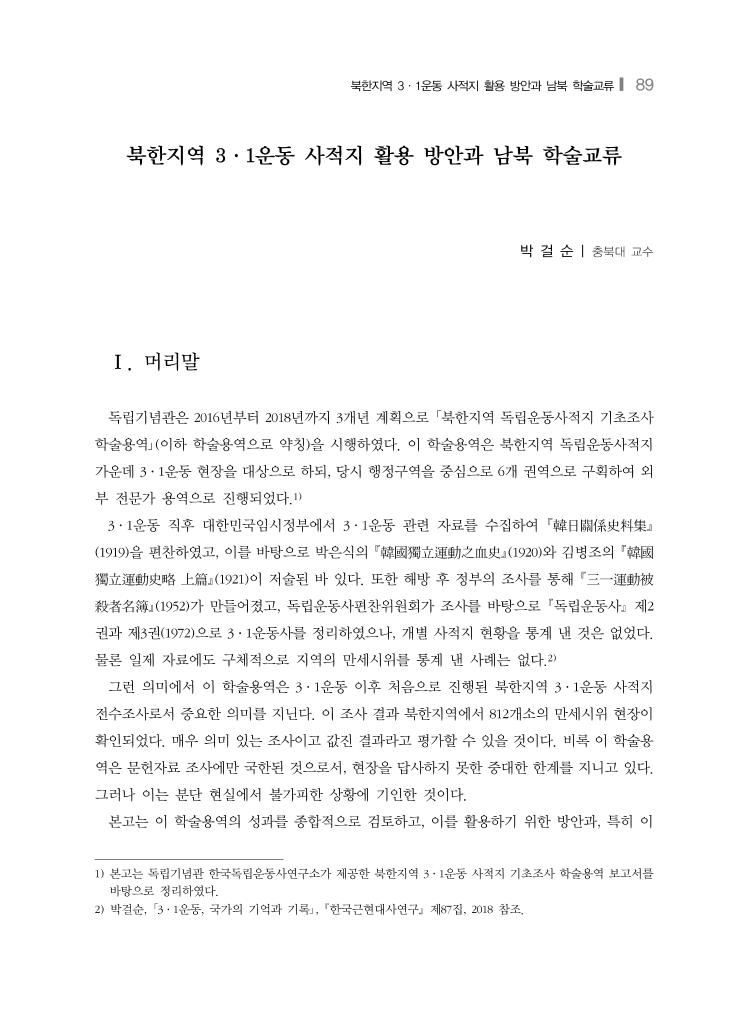 북한지역 3·1운동 사적지 활용 방안과 남북 학술교류❙ 89 북한지역 3·1운동 사적지 활용 방안과 남북 학술교류 박 걸 순 | 충북대 교수 Ⅰ. 머리말 독립기념관은 2016년부터 2018년까지 3개년 계획으로 「북한지역 독립운동사적지 기초조사 학술용역」(이하 학술용역으로 약칭)을 시행하였다. 이 학술용역은 북한지역 독립운동사적지 가운데 3·1운동 현장을 대상으로 하되, 당시 행정구역을 중심으로 6개 권역으로 구획하여 외 부 전문가 용역으로 진행되었다.1) 3·1운동 직후 대한민국임시정부에서 3·1운동 관련 자료를 수집하여 韓日關係史料集 (1919)을 편찬하였고, 이를 바탕으로 박은식의 韓國獨立運動之血史(1920)와 김병조의 韓國 獨立運動史略 上篇(1921)이 저술된 바 있다. 또한 해방 후 정부의 조사를 통해 三一運動被 殺者名簿(1952)가 만들어졌고, 독립운동사편찬위원회가 조사를 바탕으로 독립운동사 제2 권과 제3권(1972)으로 3·1운동사를 정리하였으나, 개별 사적지 현황을 통계 낸 것은 없었다. 물론 일제 자료에도 구체적으로 지역의 만세시위를 통계 낸 사례는 없다.2) 그런 의미에서 이 학술용역은 3·1운동 이후 처음으로 진행된 북한지역 3·1운동 사적지 전수조사로서 중요한 의미를 지닌다. 이 조사 결과 북한지역에서 812개소의 만세시위 현장이 확인되었다. 매우 의미 있는 조사이고 값진 결과라고 평가할 수 있을 것이다. 비록 이 학술용 역은 문헌자료 조사에만 국한된 것으로서, 현장을 답사하지 못한 중대한 한계를 지니고 있다. 그러나 이는 분단 현실에서 불가피한 상황에 기인한 것이다. 본고는 이 학술용역의 성과를 종합적으로 검토하고, 이를 활용하기 위한 방안과, 특히 이 1) 본고는 독립기념관 한국독립운동사연구소가 제공한 북한지역 3·1운동 사적지 기초조사 학술용역 보고서를 바탕으로 정리하였다. 2) 박걸순, 「3·1운동, 국가의 기억과 기록」, 한국근현대사연구 제87집, 2018 참조.