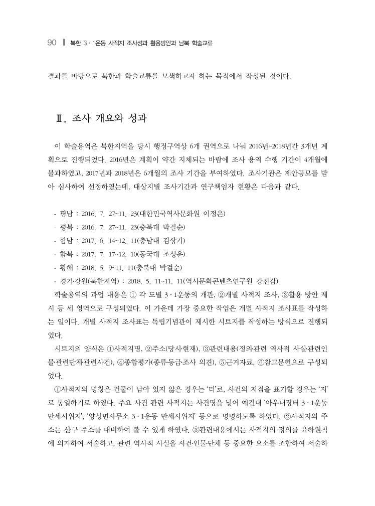 90 ❙ 북한 3·1운동 사적지 조사성과 활용방안과 남북 학술교류 결과를 바탕으로 북한과 학술교류를 모색하고자 하는 목적에서 작성된 것이다. Ⅱ. 조사 개요와 성과 이 학술용역은 북한지역을 당시 행정구역상 6개 권역으로 나눠 2016년~2018년간 3개년 계 획으로 진행되었다. 2016년은 계획이 약간 지체되는 바람에 조사 용역 수행 기간이 4개월에 불과하였고, 2017년과 2018년은 6개월의 조사 기간을 부여하였다. 조사기관은 제안공모를 받 아 심사하여 선정하였는데, 대상지별 조사기간과 연구책임자 현황은 다음과 같다. - 평남 : 2016. 7. 27~11. 23(대한민국역사문화원 이정은) - 평북 : 2016. 7. 27~11. 23(충북대 박걸순) - 함남 : 2017. 6. 14~12. 11(충남대 김상기) - 함북 : 2017. 7. 17~12. 10(동국대 조성운) - 황해 : 2018. 5. 9~11. 11(충북대 박걸순) - 경기․강원(북한지역) : 2018. 5. 11~11. 11(역사문화콘텐츠연구원 강진갑) 학술용역의 과업 내용은 ① 각 도별 3·1운동의 개관, ②개별 사적지 조사, ③활용 방안 제 시 등 세 영역으로 구성되었다. 이 가운데 가장 중요한 작업은 개별 사적지 조사표를 작성하 는 일이다. 개별 사적지 조사표는 독립기념관이 제시한 시트지를 작성하는 방식으로 진행되 었다. 시트지의 양식은 ①사적지명, ②주소(당시․현재), ③관련내용(정의․관련 역사적 사실․관련인 물․관련단체․관련사건), ④종합평가(종류․등급․조사 의견), ⑤근거자료, ⑥참고문헌으로 구성되 었다. ①사적지의 명칭은 건물이 남아 있지 않은 경우는 ‘터’로, 사건의 지점을 표기할 경우는 ‘지’ 로 통일하기로 하였다. 주요 사건 관련 사적지는 사건명을 넣어 예컨대 ‘아우내장터 3·1운동 만세시위지’, ‘양성면사무소 3·1운동 만세시위지’ 등으로 명명하도록 하였다. ②사적지의 주 소는 신․구 주소를 대비하여 볼 수 있게 하였다. ③관련내용에서는 사적지의 정의를 육하원칙 에 의거하여 서술하고, 관련 역사적 사실을 사건․인물․단체 등 중요한 요소를 조합하여 서술하