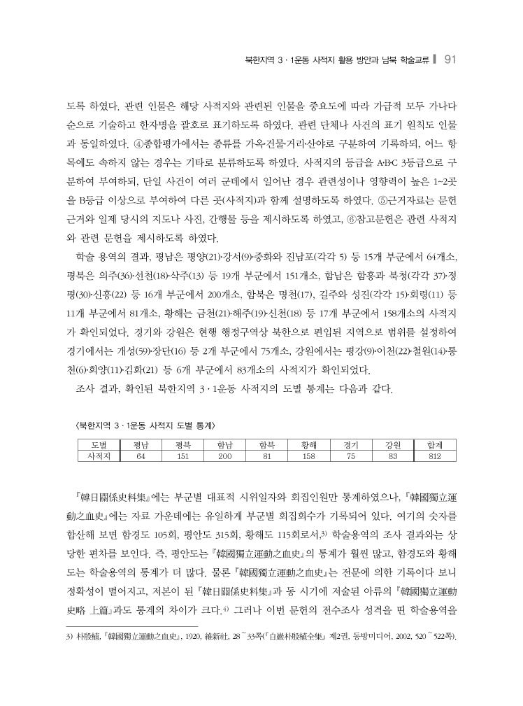 북한지역 3·1운동 사적지 활용 방안과 남북 학술교류❙ 91 도록 하였다. 관련 인물은 해당 사적지와 관련된 인물을 중요도에 따라 가급적 모두 가나다 순으로 기술하고 한자명을 괄호로 표기하도록 하였다. 관련 단체나 사건의 표기 원칙도 인물 과 동일하였다. ④종합평가에서는 종류를 가옥․건물․거리․산야로 구분하여 기록하되, 어느 항 목에도 속하지 않는 경우는 기타로 분류하도록 하였다. 사적지의 등급을 A․B․C 3등급으로 구 분하여 부여하되, 단일 사건이 여러 군데에서 일어난 경우 관련성이나 영향력이 높은 1~2곳 을 B등급 이상으로 부여하여 다른 곳(사적지)과 함께 설명하도록 하였다. ⑤근거자료는 문헌 근거와 일제 당시의 지도나 사진, 간행물 등을 제시하도록 하였고, ⑥참고문헌은 관련 사적지 와 관련 문헌을 제시하도록 하였다. 학술 용역의 결과, 평남은 평양(21)․강서(9)․중화와 진남포(각각 5) 등 15개 부군에서 64개소, 평북은 의주(36)․선천(18)․삭주(13) 등 19개 부군에서 151개소, 함남은 함흥과 북청(각각 37)․정 평(30)․신흥(22) 등 16개 부군에서 200개소, 함북은 명천(17), 길주와 성진(각각 15)․회령(11) 등 11개 부군에서 81개소, 황해는 금천(21)․해주(19)․신천(18) 등 17개 부군에서 158개소의 사적지 가 확인되었다. 경기와 강원은 현행 행정구역상 북한으로 편입된 지역으로 범위를 설정하여 경기에서는 개성(59)․장단(16) 등 2개 부군에서 75개소, 강원에서는 평강(9)․이천(22)․철원(14)․통 천(6)․회양(11)․김화(21) 등 6개 부군에서 83개소의 사적지가 확인되었다. 조사 결과, 확인된 북한지역 3·1운동 사적지의 도별 통계는 다음과 같다. <북한지역 3·1운동 사적지 도별 통계> 도별 평남 평북 함남 함북 황해 경기 강원 합계 사적지 64 151 200 81 158 75 83 812 韓日關係史料集에는 부군별 대표적 시위일자와 회집인원만 통계하였으나, 韓國獨立運 動之血史에는 자료 가운데에는 유일하게 부군별 회집회수가 기록되어 있다. 여기의 숫자를 합산해 보면 함경도 105회, 평안도 315회, 황해도 115회로서,3) 학술용역의 조사 결과와는 상 당한 편차를 보인다. 즉, 평안도는 韓國獨立運動之血史의 통계가 훨씬 많고, 함경도와 황해 도는 학술용역의 통계가 더 많다. 물론 韓國獨立運動之血史는 전문에 의한 기록이다 보니 정확성이 떨어지고, 저본이 된 韓日關係史料集과 동 시기에 저술된 아류의 韓國獨立運動 史略 上篇과도 통계의 차이가 크다.4) 그러나 이번 문헌의 전수조사 성격을 띤 학술용역을 3) 朴殷植, 韓國獨立運動之血史, 1920, 維新社, 28~33쪽(白巖朴殷植全集 제2권, 동방미디어, 2002, 520~522쪽).
