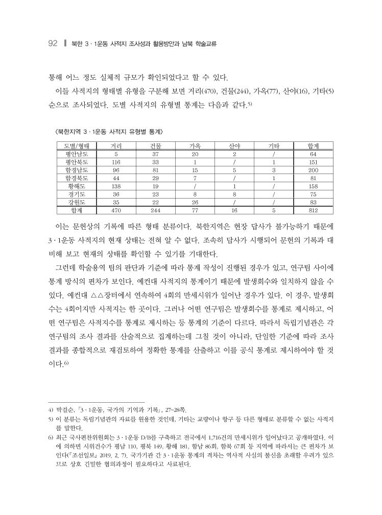 92 ❙ 북한 3·1운동 사적지 조사성과 활용방안과 남북 학술교류 통해 어느 정도 실체적 규모가 확인되었다고 할 수 있다. 이들 사적지의 형태별 유형을 구분해 보면 거리(470), 건물(244), 가옥(77), 산야(16), 기타(5) 순으로 조사되었다. 도별 사적지의 유형별 통계는 다음과 같다.5) <북한지역 3·1운동 사적지 유형별 통계> 도별/형태 거리 건물 가옥 산야 기타 합계 평안남도 5 37 20 2 / 64 평안북도 116 33 1 / 1 151 함경남도 96 81 15 5 3 200 함경북도 44 29 7 / 1 81 황해도 138 19 / 1 / 158 경기도 36 23 8 8 / 75 강원도 35 22 26 / / 83 합계 470 244 77 16 5 812 이는 문헌상의 기록에 따른 형태 분류이다. 북한지역은 현장 답사가 불가능하기 때문에 3·1운동 사적지의 현재 상태는 전혀 알 수 없다. 조속히 답사가 시행되어 문헌의 기록과 대 비해 보고 현재의 상태를 확인할 수 있기를 기대한다. 그런데 학술용역 팀의 판단과 기준에 따라 통계 작성이 진행된 경우가 있고, 연구팀 사이에 통계 방식의 편차가 보인다. 예컨대 사적지의 통계이기 때문에 발생회수와 일치하지 않을 수 있다. 예컨대 △△장터에서 연속하여 4회의 만세시위가 일어난 경우가 있다. 이 경우, 발생회 수는 4회이지만 사적지는 한 곳이다. 그러나 어떤 연구팀은 발생회수를 통계로 제시하고, 어 떤 연구팀은 사적지수를 통계로 제시하는 등 통계의 기준이 다르다. 따라서 독립기념관은 각 연구팀의 조사 결과를 산술적으로 집계하는데 그칠 것이 아니라, 단일한 기준에 따라 조사 결과를 종합적으로 재검토하여 정확한 통계를 산출하고 이를 공식 통계로 제시하여야 할 것 이다.6) 4) 박걸순, 「3·1운동, 국가의 기억과 기록」, 27~28쪽. 5) 이 분류는 독립기념관의 자료를 원용한 것인데, 기타는 교량이나 항구 등 다른 형태로 분류할 수 없는 사적지 를 말한다. 6) 최근 국사편찬위원회는 3·1운동 D/B를 구축하고 전국에서 1,716건의 만세시위가 일어났다고 공개하였다. 이 에 의하면 시위건수가 평남 110, 평북 149, 황해 181, 함남 86회, 함북 67회 등 지역에 따라서는 큰 편차가 보 인다(조선일보 2019. 2. 7). 국가기관 간 3·1운동 통계의 격차는 역사적 사실의 불신을 초래할 우려가 있으 므로 상호 긴밀한 협의과정이 필요하다고 사료된다.