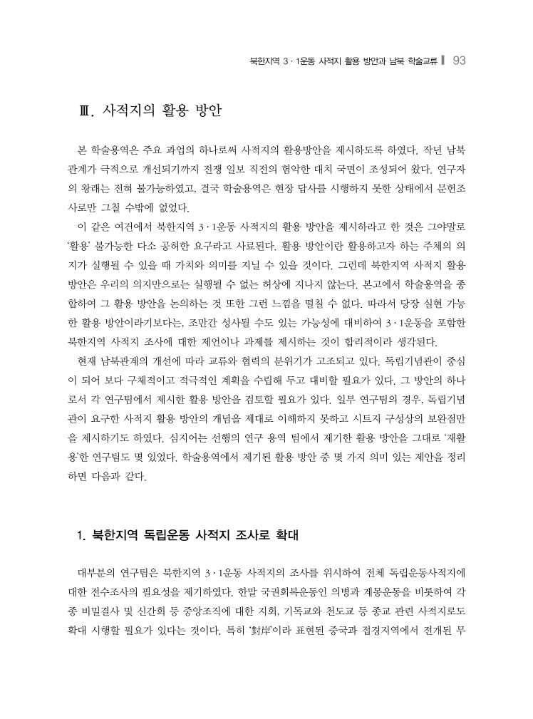 북한지역 3·1운동 사적지 활용 방안과 남북 학술교류❙ 93 Ⅲ. 사적지의 활용 방안 본 학술용역은 주요 과업의 하나로써 사적지의 활용방안을 제시하도록 하였다. 작년 남북 관계가 극적으로 개선되기까지 전쟁 일보 직전의 험악한 대치 국면이 조성되어 왔다. 연구자 의 왕래는 전혀 불가능하였고, 결국 학술용역은 현장 답사를 시행하지 못한 상태에서 문헌조 사로만 그칠 수밖에 없었다. 이 같은 여건에서 북한지역 3·1운동 사적지의 활용 방안을 제시하라고 한 것은 그야말로 ‘활용’ 불가능한 다소 공허한 요구라고 사료된다. 활용 방안이란 활용하고자 하는 주체의 의 지가 실행될 수 있을 때 가치와 의미를 지닐 수 있을 것이다. 그런데 북한지역 사적지 활용 방안은 우리의 의지만으로는 실행될 수 없는 허상에 지나지 않는다. 본고에서 학술용역을 종 합하여 그 활용 방안을 논의하는 것 또한 그런 느낌을 떨칠 수 없다. 따라서 당장 실현 가능 한 활용 방안이라기보다는, 조만간 성사될 수도 있는 가능성에 대비하여 3·1운동을 포함한 북한지역 사적지 조사에 대한 제언이나 과제를 제시하는 것이 합리적이라 생각된다. 현재 남북관계의 개선에 따라 교류와 협력의 분위기가 고조되고 있다. 독립기념관이 중심 이 되어 보다 구체적이고 적극적인 계획을 수립해 두고 대비할 필요가 있다. 그 방안의 하나 로서 각 연구팀에서 제시한 활용 방안을 검토할 필요가 있다. 일부 연구팀의 경우, 독립기념 관이 요구한 사적지 활용 방안의 개념을 제대로 이해하지 못하고 시트지 구성상의 보완점만 을 제시하기도 하였다. 심지어는 선행의 연구 용역 팀에서 제기한 활용 방안을 그대로 ‘재활 용’한 연구팀도 몇 있었다. 학술용역에서 제기된 활용 방안 중 몇 가지 의미 있는 제안을 정리 하면 다음과 같다. 1. 북한지역 독립운동 사적지 조사로 확대 대부분의 연구팀은 북한지역 3·1운동 사적지의 조사를 위시하여 전체 독립운동사적지에 대한 전수조사의 필요성을 제기하였다. 한말 국권회복운동인 의병과 계몽운동을 비롯하여 각 종 비밀결사 및 신간회 등 중앙조직에 대한 지회, 기독교와 천도교 등 종교 관련 사적지로도 확대 시행할 필요가 있다는 것이다. 특히 ‘對岸’이라 표현된 중국과 접경지역에서 전개된 무