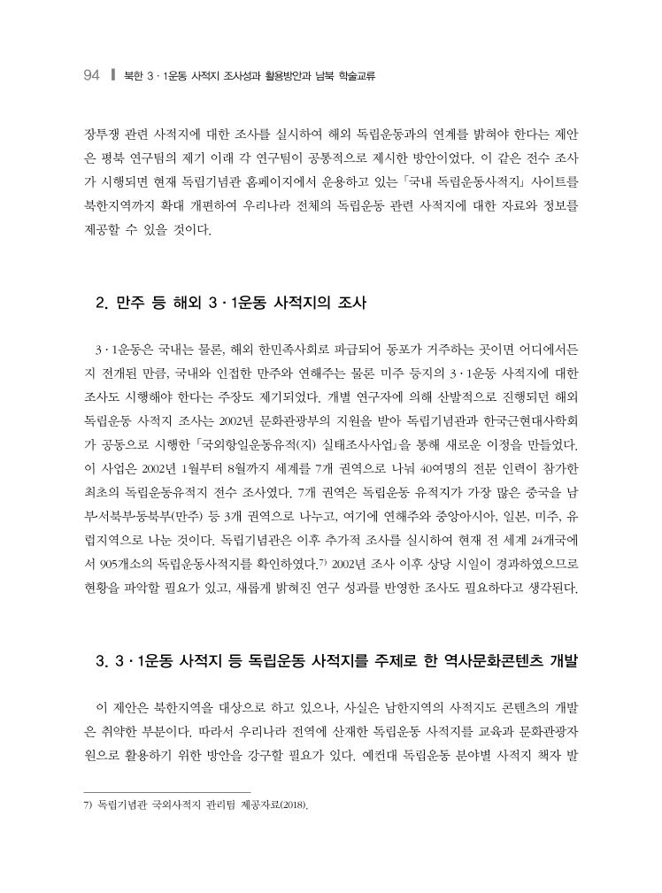 94 ❙ 북한 3·1운동 사적지 조사성과 활용방안과 남북 학술교류 장투쟁 관련 사적지에 대한 조사를 실시하여 해외 독립운동과의 연계를 밝혀야 한다는 제안 은 평북 연구팀의 제기 이래 각 연구팀이 공통적으로 제시한 방안이었다. 이 같은 전수 조사 가 시행되면 현재 독립기념관 홈페이지에서 운용하고 있는 「국내 독립운동사적지」 사이트를 북한지역까지 확대 개편하여 우리나라 전체의 독립운동 관련 사적지에 대한 자료와 정보를 제공할 수 있을 것이다. 2. 만주 등 해외 3·1운동 사적지의 조사 3·1운동은 국내는 물론, 해외 한민족사회로 파급되어 동포가 거주하는 곳이면 어디에서든 지 전개된 만큼, 국내와 인접한 만주와 연해주는 물론 미주 등지의 3·1운동 사적지에 대한 조사도 시행해야 한다는 주장도 제기되었다. 개별 연구자에 의해 산발적으로 진행되던 해외 독립운동 사적지 조사는 2002년 문화관광부의 지원을 받아 독립기념관과 한국근현대사학회 가 공동으로 시행한 「국외항일운동유적(지) 실태조사사업」을 통해 새로운 이정을 만들었다. 이 사업은 2002년 1월부터 8월까지 세계를 7개 권역으로 나눠 40여명의 전문 인력이 참가한 최초의 독립운동유적지 전수 조사였다. 7개 권역은 독립운동 유적지가 가장 많은 중국을 남 부․서북부․동북부(만주) 등 3개 권역으로 나누고, 여기에 연해주와 중앙아시아, 일본, 미주, 유 럽지역으로 나눈 것이다. 독립기념관은 이후 추가적 조사를 실시하여 현재 전 세계 24개국에 서 905개소의 독립운동사적지를 확인하였다.7) 2002년 조사 이후 상당 시일이 경과하였으므로 현황을 파악할 필요가 있고, 새롭게 밝혀진 연구 성과를 반영한 조사도 필요하다고 생각된다. 3. 3·1운동 사적지 등 독립운동 사적지를 주제로 한 역사문화콘텐츠 개발 이 제안은 북한지역을 대상으로 하고 있으나, 사실은 남한지역의 사적지도 콘텐츠의 개발 은 취약한 부분이다. 따라서 우리나라 전역에 산재한 독립운동 사적지를 교육과 문화관광자 원으로 활용하기 위한 방안을 강구할 필요가 있다. 예컨대 독립운동 분야별 사적지 책자 발 7) 독립기념관 국외사적지 관리팀 제공자료(2018).