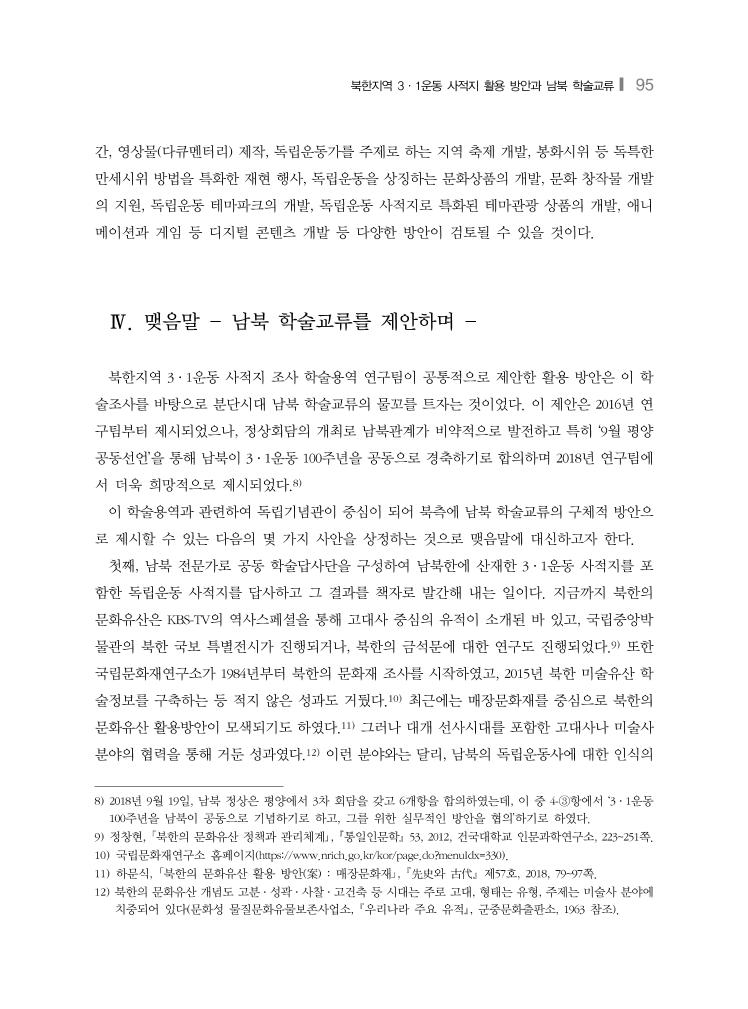 북한지역 3·1운동 사적지 활용 방안과 남북 학술교류❙ 95 간, 영상물(다큐멘터리) 제작, 독립운동가를 주제로 하는 지역 축제 개발, 봉화시위 등 독특한 만세시위 방법을 특화한 재현 행사, 독립운동을 상징하는 문화상품의 개발, 문화 창작물 개발 의 지원, 독립운동 테마파크의 개발, 독립운동 사적지로 특화된 테마관광 상품의 개발, 애니 메이션과 게임 등 디지털 콘텐츠 개발 등 다양한 방안이 검토될 수 있을 것이다. Ⅳ. 맺음말 - 남북 학술교류를 제안하며 - 북한지역 3·1운동 사적지 조사 학술용역 연구팀이 공통적으로 제안한 활용 방안은 이 학 술조사를 바탕으로 분단시대 남북 학술교류의 물꼬를 트자는 것이었다. 이 제안은 2016년 연 구팀부터 제시되었으나, 정상회담의 개최로 남북관계가 비약적으로 발전하고 특히 ‘9월 평양 공동선언’을 통해 남북이 3·1운동 100주년을 공동으로 경축하기로 합의하며 2018년 연구팀에 서 더욱 희망적으로 제시되었다.8) 이 학술용역과 관련하여 독립기념관이 중심이 되어 북측에 남북 학술교류의 구체적 방안으 로 제시할 수 있는 다음의 몇 가지 사안을 상정하는 것으로 맺음말에 대신하고자 한다. 첫째, 남북 전문가로 공동 학술답사단을 구성하여 남북한에 산재한 3·1운동 사적지를 포 함한 독립운동 사적지를 답사하고 그 결과를 책자로 발간해 내는 일이다. 지금까지 북한의 문화유산은 KBS-TV의 역사스페셜을 통해 고대사 중심의 유적이 소개된 바 있고, 국립중앙박 물관의 북한 국보 특별전시가 진행되거나, 북한의 금석문에 대한 연구도 진행되었다.9) 또한 국립문화재연구소가 1984년부터 북한의 문화재 조사를 시작하였고, 2015년 북한 미술유산 학 술정보를 구축하는 등 적지 않은 성과도 거뒀다.10) 최근에는 매장문화재를 중심으로 북한의 문화유산 활용방안이 모색되기도 하였다.11) 그러나 대개 선사시대를 포함한 고대사나 미술사 분야의 협력을 통해 거둔 성과였다.12) 이런 분야와는 달리, 남북의 독립운동사에 대한 인식의 8) 2018년 9월 19일, 남북 정상은 평양에서 3차 회담을 갖고 6개항을 합의하였는데, 이 중 4-③항에서 ‘3·1운동 100주년을 남북이 공동으로 기념하기로 하고, 그를 위한 실무적인 방안을 협의’하기로 하였다. 9) 정창현, 「북한의 문화유산 정책과 관리체계」, 통일인문학 53, 2012, 건국대학교 인문과학연구소, 223~251쪽. 10) 국립문화재연구소 홈페이지(https://www.nrich.go.kr/kor/page.do?menuIdx=330). 11) 하문식, 「북한의 문화유산 활용 방안(案) : 매장문화재」, 先史와 古代 제57호, 2018, 79~97쪽. 12) 북한의 문화유산 개념도 고분·성곽·사찰·고건축 등 시대는 주로 고대, 형태는 유형, 주제는 미술사 분야에 치중되어 있다(문화성 물질문화유물보존사업소, 우리나라 주요 유적, 군중문화출판소, 1963 참조).