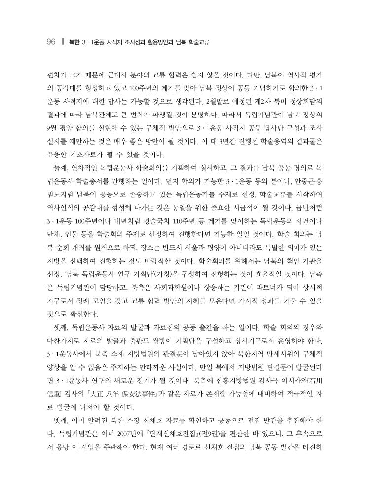 96 ❙ 북한 3·1운동 사적지 조사성과 활용방안과 남북 학술교류 편차가 크기 때문에 근대사 분야의 교류 협력은 쉽지 않을 것이다. 다만, 남북이 역사적 평가 의 공감대를 형성하고 있고 100주년의 계기를 맞아 남북 정상이 공동 기념하기로 합의한 3·1 운동 사적지에 대한 답사는 가능할 것으로 생각된다. 2월말로 예정된 제2차 북미 정상회담의 결과에 따라 남북관계도 큰 변화가 파생될 것이 분명하다. 따라서 독립기념관이 남북 정상의 9월 평양 합의를 실현할 수 있는 구체적 방안으로 3·1운동 사적지 공동 답사단 구성과 조사 실시를 제안하는 것은 매우 좋은 방안이 될 것이다. 이 때 3년간 진행된 학술용역의 결과물은 유용한 기초자료가 될 수 있을 것이다. 둘째, 연차적인 독립운동사 학술회의를 기획하여 실시하고, 그 결과를 남북 공동 명의로 독 립운동사 학술총서를 간행하는 일이다. 먼저 합의가 가능한 3·1운동 등의 분야나, 안중근․홍 범도처럼 남북이 공동으로 존숭하고 있는 독립운동가를 주제로 선정, 학술교류를 시작하여 역사인식의 공감대를 형성해 나가는 것은 통일을 위한 중요한 시금석이 될 것이다. 금년처럼 3·1운동 100주년이나 내년처럼 경술국치 110주년 등 계기를 맞이하는 독립운동의 사건이나 단체, 인물 등을 학술회의 주제로 선정하여 진행한다면 가능한 일일 것이다. 학술 희의는 남 북 순회 개최를 원칙으로 하되, 장소는 반드시 서울과 평양이 아니더라도 특별한 의미가 있는 지방을 선택하여 진행하는 것도 바람직할 것이다. 학술회의를 위해서는 남북의 책임 기관을 선정, ‘남북 독립운동사 연구 기획단’(가칭)을 구성하여 진행하는 것이 효율적일 것이다. 남측 은 독립기념관이 담당하고, 북측은 사회과학원이나 상응하는 기관이 파트너가 되어 상시적 기구로서 정례 모임을 갖고 교류 협력 방안의 지혜를 모은다면 가시적 성과를 거둘 수 있을 것으로 확신한다. 셋째, 독립운동사 자료의 발굴과 자료집의 공동 출간을 하는 일이다. 학술 회의의 경우와 마찬가지로 자료의 발굴과 출판도 쌍방이 기획단을 구성하고 상시기구로서 운영해야 한다. 3·1운동사에서 북측 소재 지방법원의 판결문이 남아있지 않아 북한지역 만세시위의 구체적 양상을 알 수 없음은 주지하는 안타까운 사실이다. 만일 북에서 지방법원 판결문이 발굴된다 면 3·1운동사 연구의 새로운 전기가 될 것이다. 북측에 함흥지방법원 검사국 이시카와[石川 信重] 검사의 「大正 八年 保安法事件」과 같은 자료가 존재할 가능성에 대비하여 적극적인 자 료 발굴에 나서야 할 것이다. 넷째, 이미 알려진 북한 소장 신채호 자료를 확인하고 공동으로 전집 발간을 추진해야 한 다. 독립기념관은 이미 2007년에 단재신채호전집(전9권)을 편찬한 바 있으니, 그 후속으로 서 응당 이 사업을 주관해야 한다. 현재 여러 경로로 신채호 전집의 남북 공동 발간을 타진하