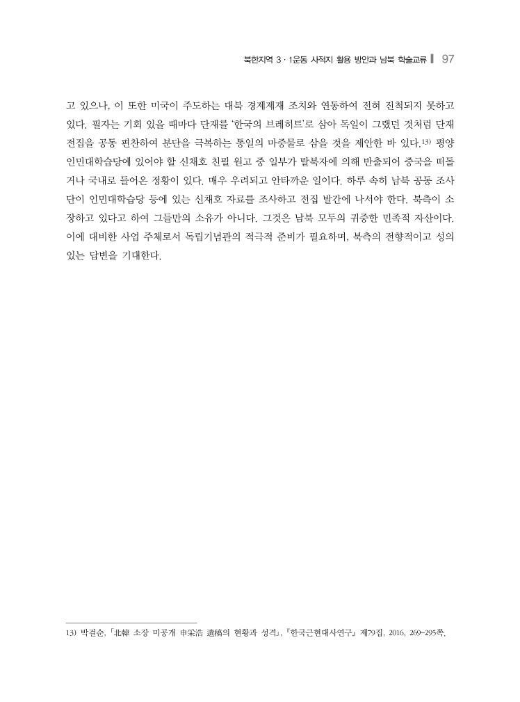 북한지역 3·1운동 사적지 활용 방안과 남북 학술교류❙ 97 고 있으나, 이 또한 미국이 주도하는 대북 경제제재 조치와 연동하여 전혀 진척되지 못하고 있다. 필자는 기회 있을 때마다 단재를 ‘한국의 브레히트’로 삼아 독일이 그랬던 것처럼 단재 전집을 공동 편찬하여 분단을 극복하는 통일의 마중물로 삼을 것을 제안한 바 있다.13) 평양 인민대학습당에 있어야 할 신채호 친필 원고 중 일부가 탈북자에 의해 반출되어 중국을 떠돌 거나 국내로 들어온 정황이 있다. 매우 우려되고 안타까운 일이다. 하루 속히 남북 공동 조사 단이 인민대학습당 등에 있는 신채호 자료를 조사하고 전집 발간에 나서야 한다. 북측이 소 장하고 있다고 하여 그들만의 소유가 아니다. 그것은 남북 모두의 귀중한 민족적 자산이다. 이에 대비한 사업 주체로서 독립기념관의 적극적 준비가 필요하며, 북측의 전향적이고 성의 있는 답변을 기대한다. 13) 박걸순, 「北韓 소장 미공개 申采浩 遺稿의 현황과 성격」, 한국근현대사연구 제79집, 2016, 269~295쪽.